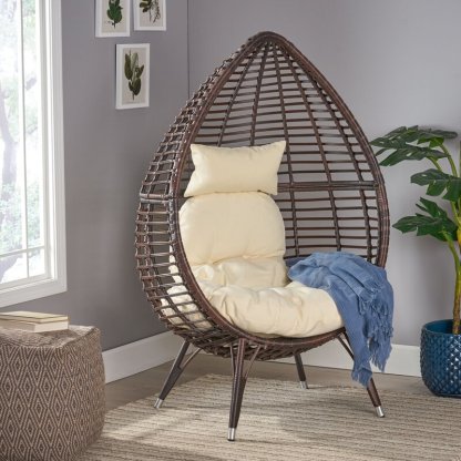 Bring a cozy accessory to your home that gives your lounge space a gentle and homey atmosphere for all to enjoy. Featuring a gorgeous teardrop shape and intricate grid design, our basket chair not only gives your interior space a modern look but also offers incredible comfort. This is constructed with beautifully wrapped wicker with a sturdy metal frame, allowing you hours of relaxation whenever you need it. Finished with plush water-resistant cushions, this piece is a truly extraordinary addition to any room.