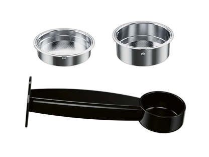 Included accessories: portafilter, 2 sieves, coffee powder spoon with included tamper
