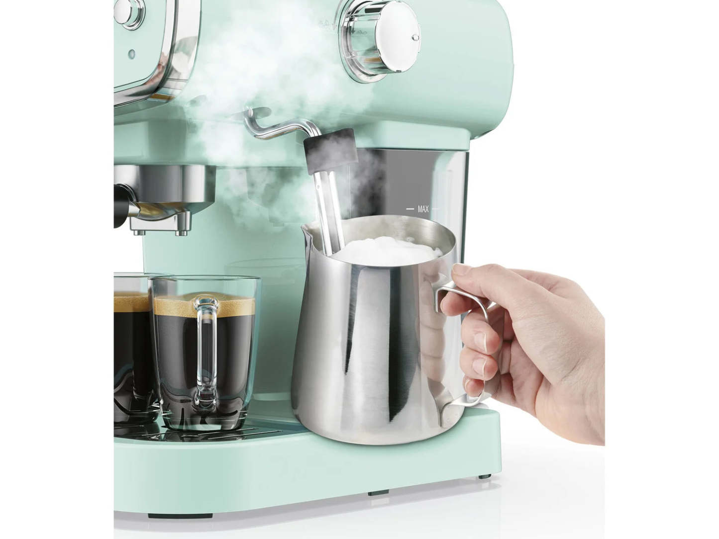 - 2-in-1 high-pressure steam nozzle: hot water outlet and milk frothing nozzle