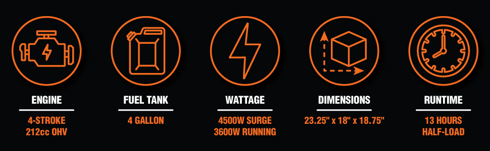 - Generate up to 4500 starting watts and 3600 running watts