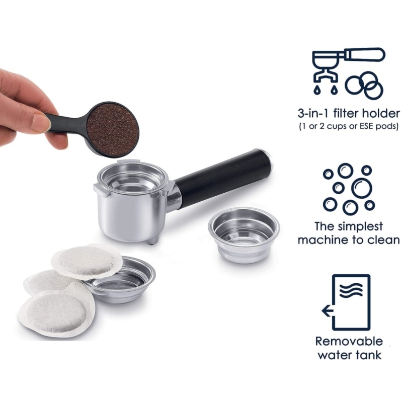 Brew Like A ProThis machine gives you the power to brew authentic barista-quality beverages just like your favorite coffeehouse. | Easy To UseThe machine does the work for you. The Automatic Flow Stop feature dispenses just the right amount of espresso, taking out the guesswork. | Accommodate Taller CupsIf you’d prefer a larger-sized beverage, no problem. The double drip tray is easy to adjust or remove to fit taller cups, such as latte glasses. |