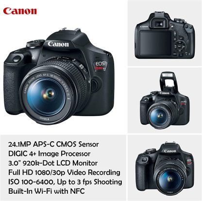 - Cámara Canon EOS Rebel T7 DSLR - Sensor CMOS APS-C de 24.1 MP - Procesador de imagen DIGIC 4+ - Monitor de 7.6 cm LCD de 920 K - Grabación de video Full HD 1080/30p - AF de 9 puntos con punto de tipo cruz central - ISO 100-6,400, hasta 3 fps - Wi-Fi integrado con NFC - Escena inteligente - Modo automático - Filtros creativos y modos automáticos creativos