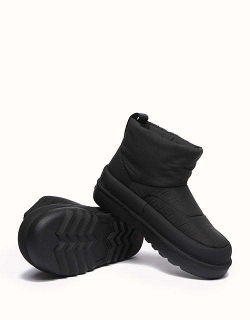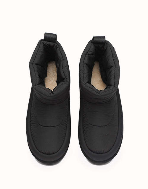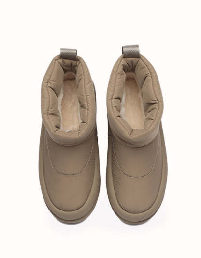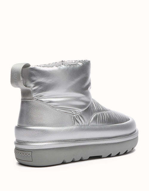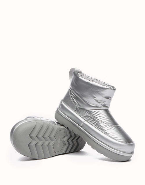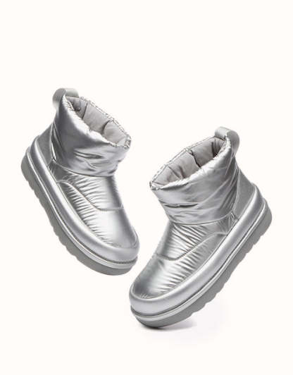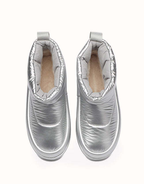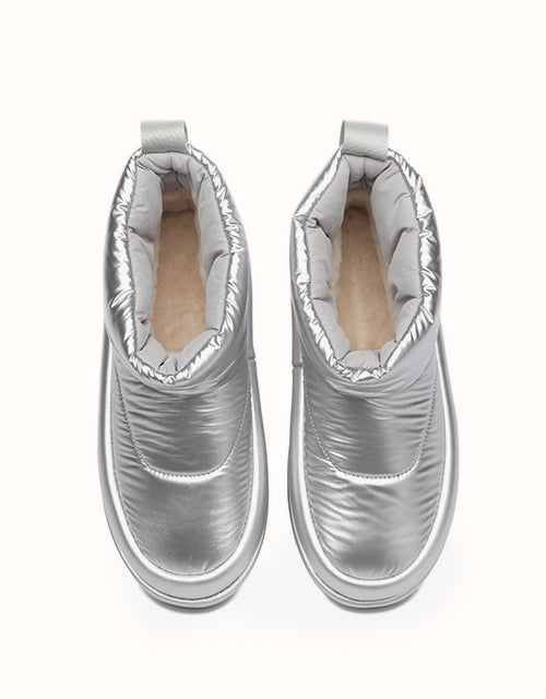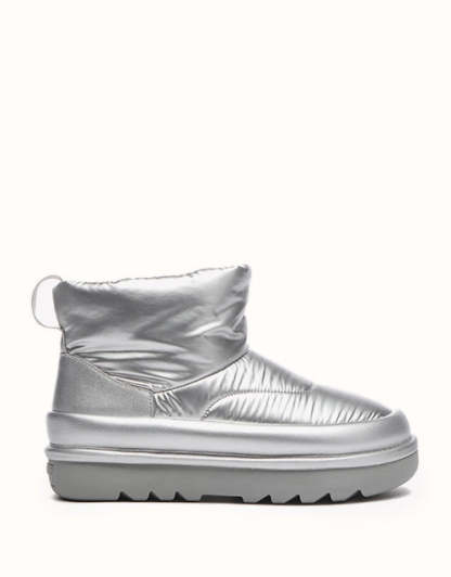 Adopta un estilo futurista con nuestras botas acolchadas plateadas metalizadas, diseñadas para capturar la esencia de la tendencia de los años 2000. Confeccionadas con una elegante parte superior de tela tipo paraguas, estas botas tienen una silueta redondeada y una lengüeta con la marca EVEthtRAU para un toque divertido pero sofisticado. El forro de lana merino austriaca 100% proporciona una calidez excepcional y una comodidad que absorbe la humedad, mientras que la suela exterior de TPR duradera ofrece flexibilidad, agarre y soporte ligeros. Perfectas para añadir un toque atrevido y llamativo a tu vestuario de invierno.