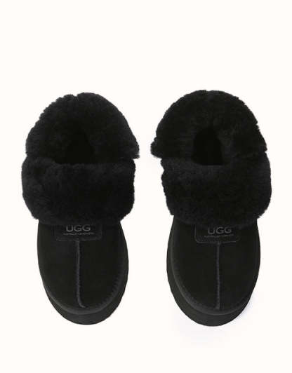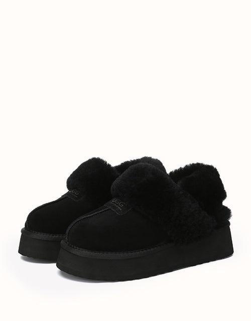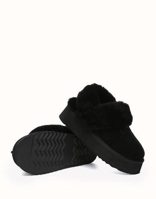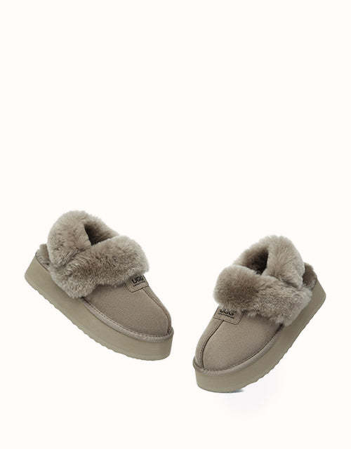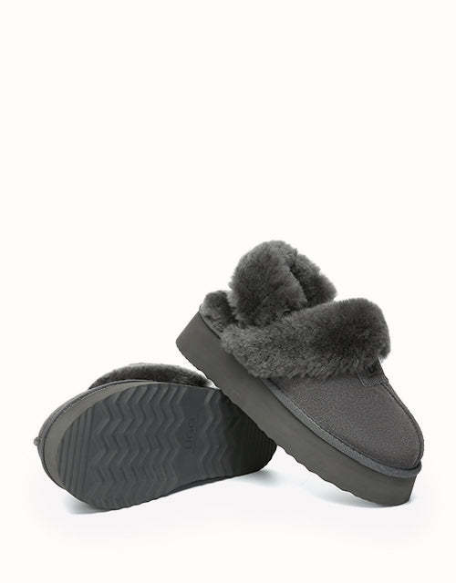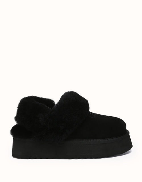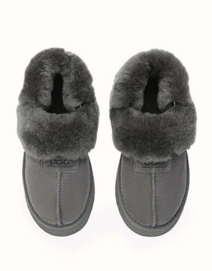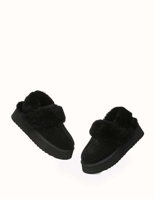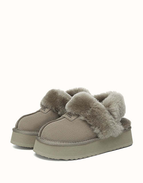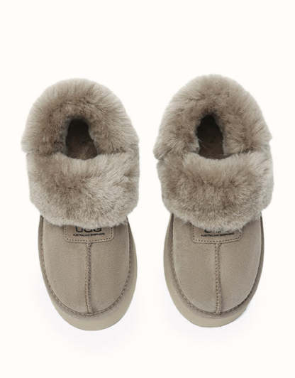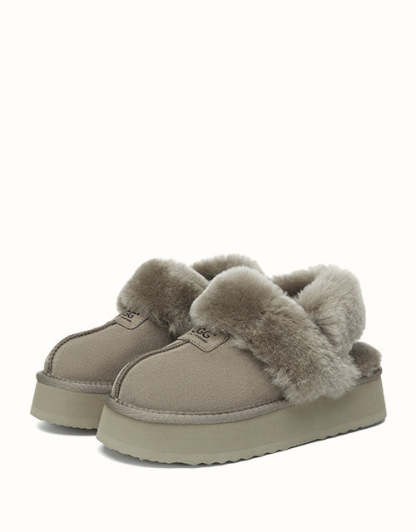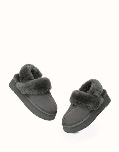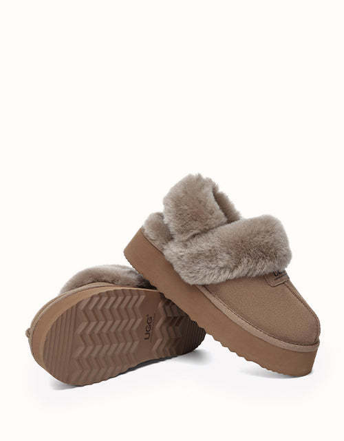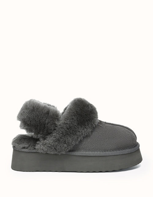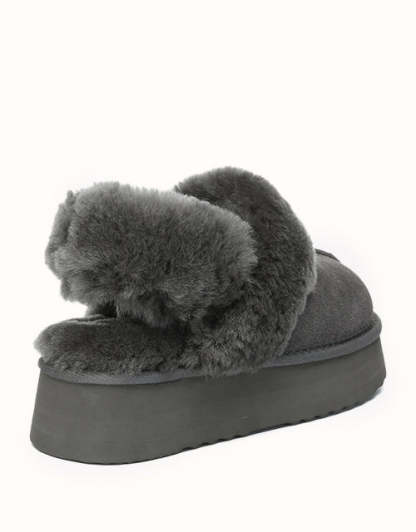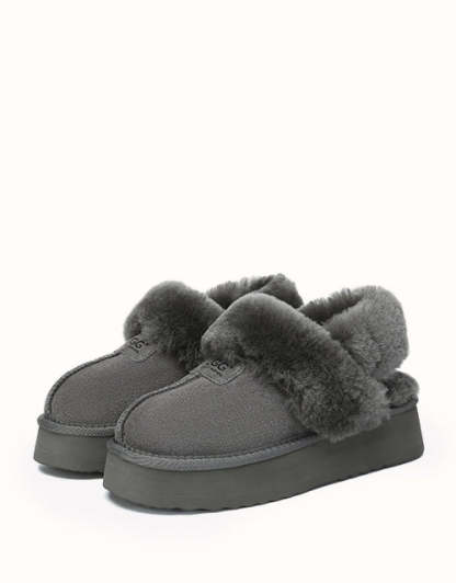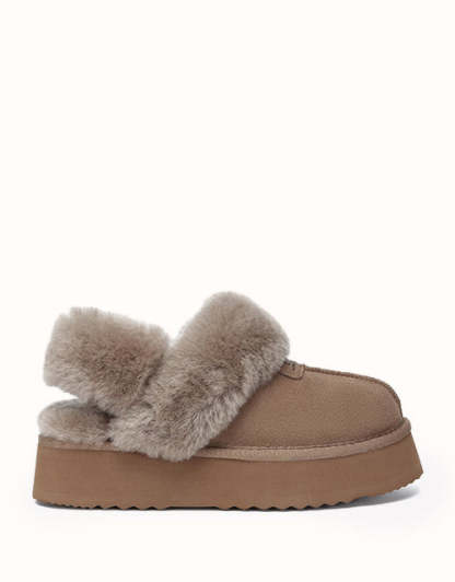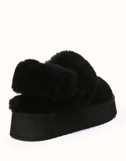 Las pantuflas de plataforma UGthtG Suzie con tira trasera, confeccionadas en piel de pastor australiano, son un básico para el invierno. Con una tira elástica extraíble, ofrecen una comodidad óptima sin sacrificar la practicidad de un diseño sin cordones. Disponibles en cinco versátiles tonos neutros, estas pantuflas tienen una suela de plataforma gruesa que realzará cualquier conjunto.